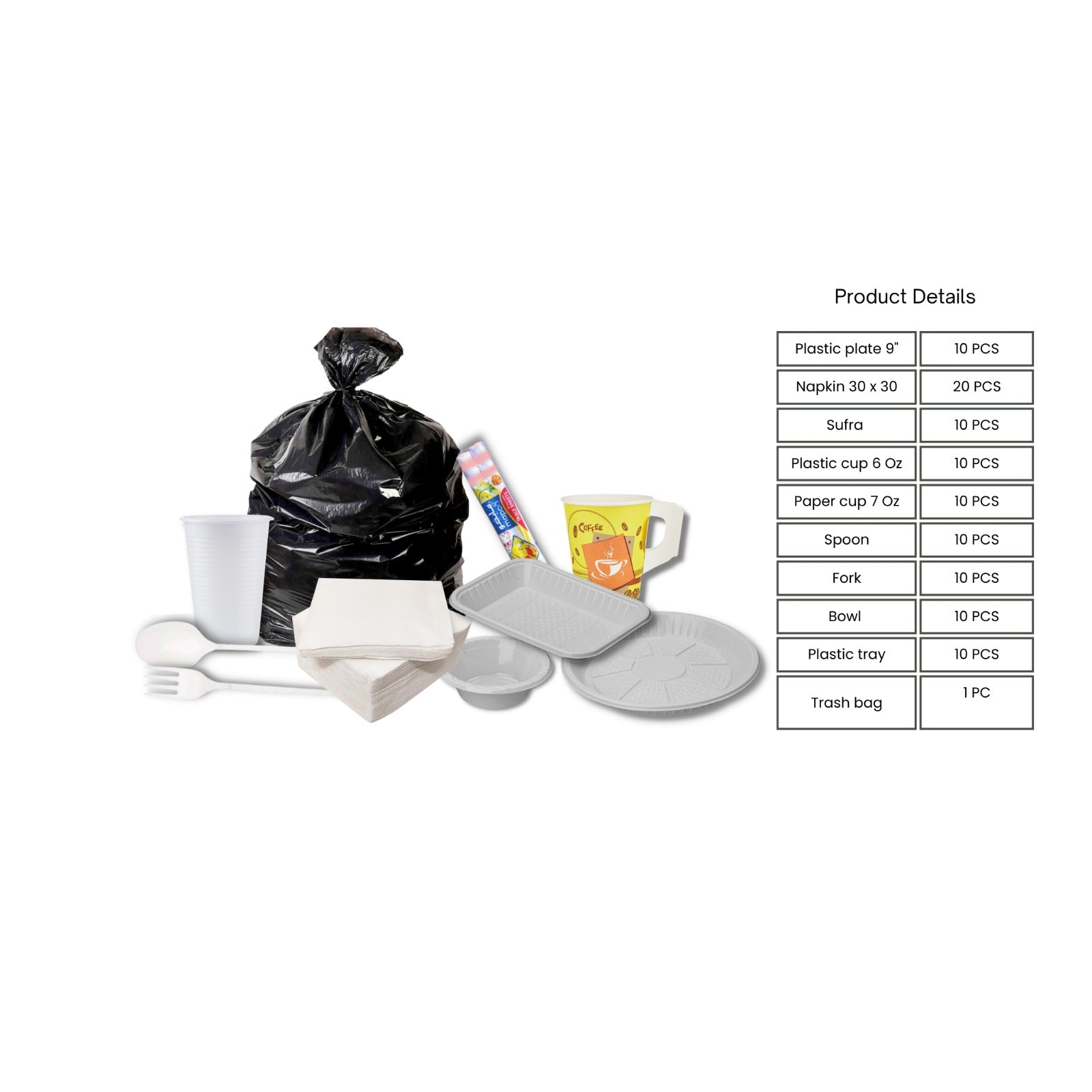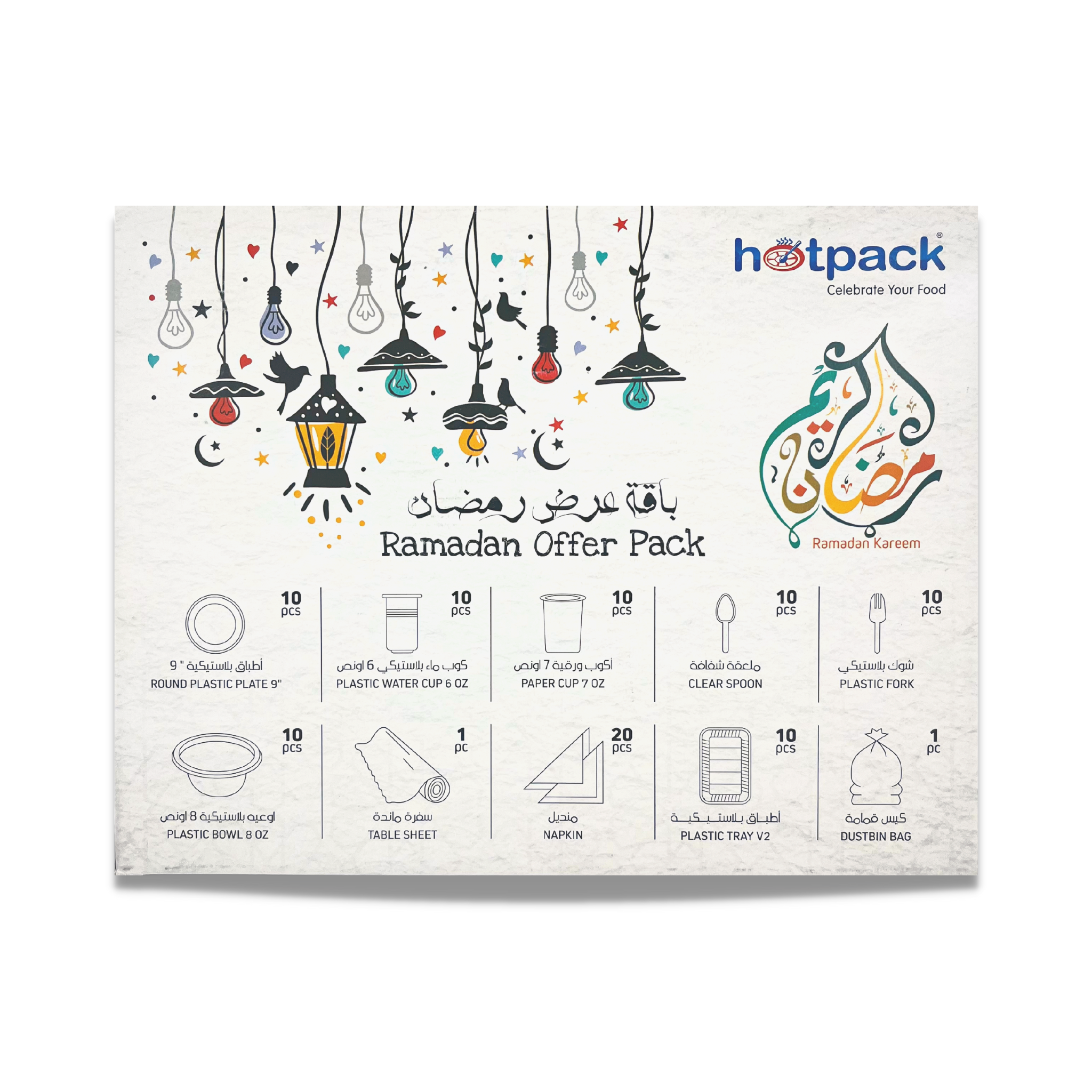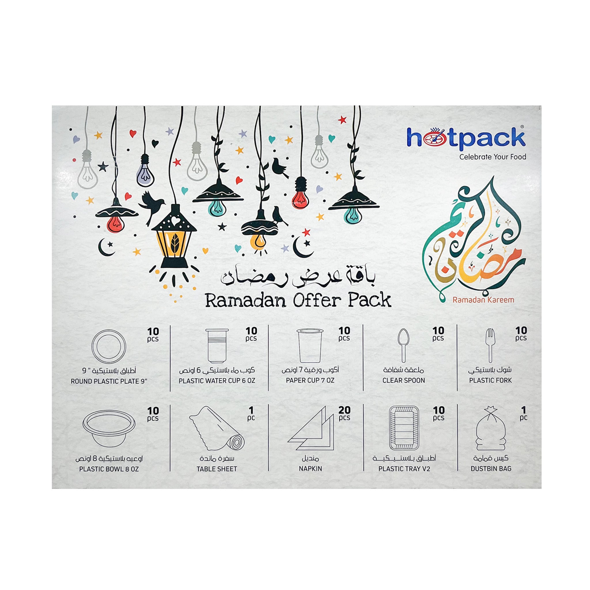 Every Ramadan we bring you the perfect gift for your loved ones! A combo pack of the essentials needful during Ramadan. This year our selection includes the best selling Hotpack Plastic plates(10), Napkin 30x30(20), Sufra(10), Plastic cup 6 oz(10), Paper cup 7 oz(10), Spoon(10), Fork (10), Bowl(10), Plastic tray(10), and Trash bag (1). Celebrate this Ramadan with Hotpack!